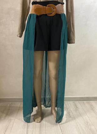 На теле нет (на манникене) Шорты короткие,тягучие,на талии резинка средней ширины с небольшими складками,впереди два кармана,фасон слегка клёш)подойдёт на с л м можно одевать на них пояс ремень) Юбка накидка ручной работы)красиво ею можно дополнить стиль,на талии широкий ремень резинка,шифон из трёх слоев)из нюансов небольшие трещины внутри ремня,и снизу слегка отслоился овэрлочный шов всё указано на фото)и разного цвета,на вид и носку не влияет) Замеры шортов Длина 37,5 см) Пот 40 см) Поб 64 см) Полуобхват снизу одной штаныны 41 см) Высота посадки 37 см) Замеры юбки накидки Длина 107 см Пот 39 см) Ширина одного шифона 39,5 см)