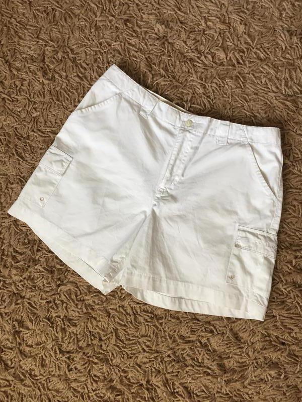 Білі шорти Columbia з щільного бавовни відмінної якості. Бавовна щільний, не просвічує. Посадка висока, врізні косі кишені на стегнах. На боках накладні кишеньки, на попі дрібні врізні . Розмір вказано 10-12, добре сідають на наш 46-48. Заміри: ПОТ-40см ПОБІДИ-53см Довжина (зовнішній шов) - Довжина 37см (внутрішній шов) - 12см Ширина штанини - 32см Висота пройми (спереду) - 27см Висота пройми (ззаду) - 40см Стан добрий, трохи катишки на внутрішній стороні ззаду (видно на фото)