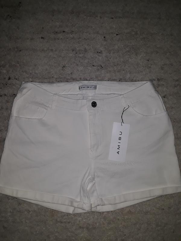 якісні білі шорти,з тонкого джинсу, в розмірі 🌿34- XS.висота 33см.ширина 34см.в бедрах 44см. 🌿40- L.висота 36см.ширина 40см.в бедрах 50см 👌97% коттон.3% еластан,дуже гарно тягнуться..