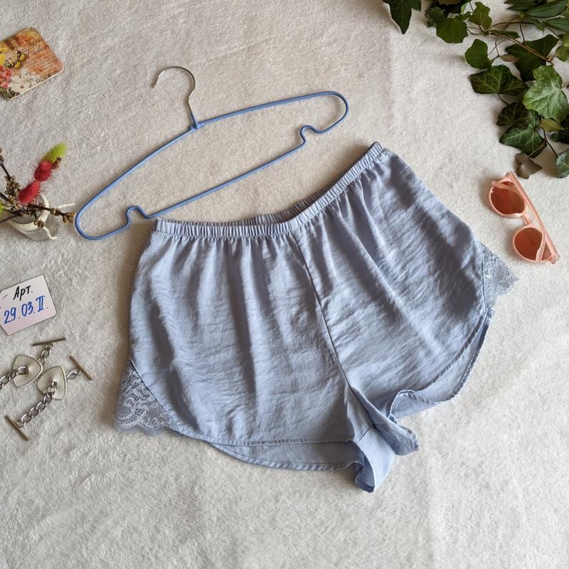 очень лёгкие голубые домашние шортики h&m размер S подойдёт также на м пот 35-51 в поясе поб 49 57 длина по боковому шву 26 см 100% полиэстер состояние близко к отличному