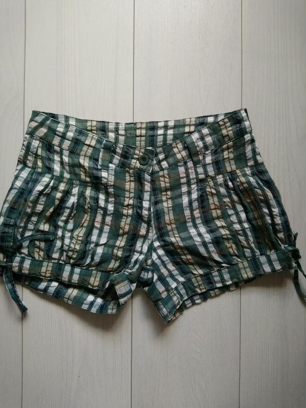 Шорти в дуже хорошому стані Матеріал 80% котон і 20% поліестр Тоненькі Розмір М Довжина з боку 28 см Півобсяг пояса 36-38 см Півобсяг бедер 52 см Низ штанки стягується шнурівкою
