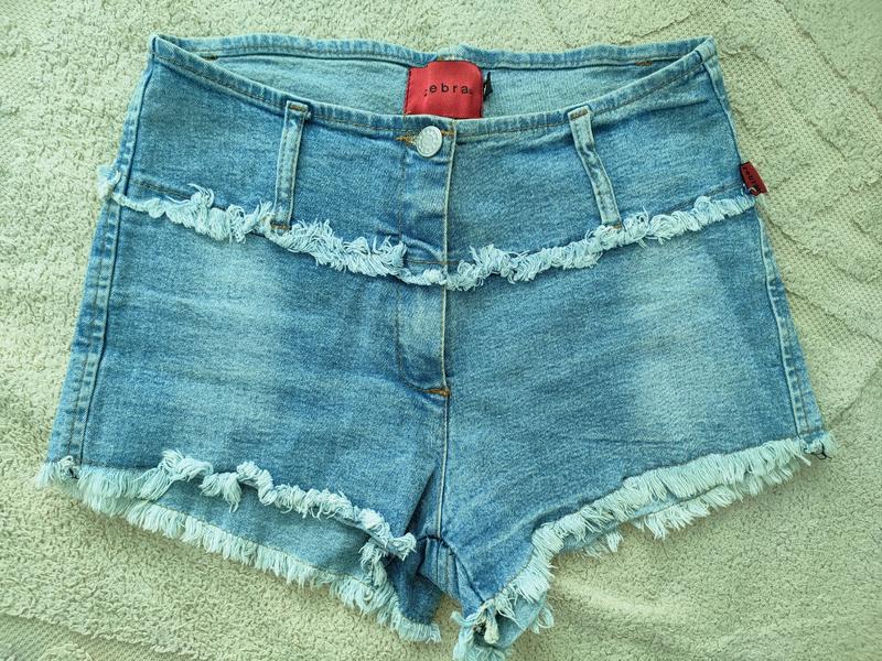 короткі джинсові шорти в блакитному кольорі. гарно по фігурі, на замочок і гудзик. розмірS заміри: пояс до 32 см + тягнеться, бокова довжина-24 см.