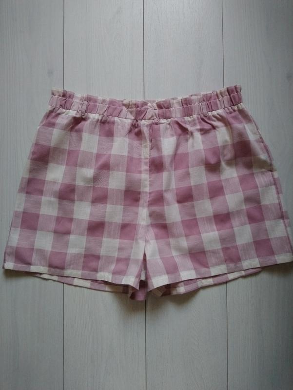 Шорти в дуже хорошому стані Пояс на резинці Розмір UK 16, EUR 46 Матеріал 67% поліестр і 33% котон З дефектів між ногами є катишки Довжина 44 см Посадка спереду 42 см Півобсяг пояса 44 см і тягнеться до 63 см Півобсяг бедер 67 см