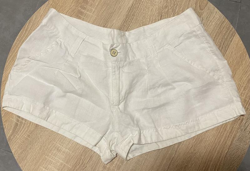 Белые льняные шорты. Очень красиво смотрятся на загорелом теле. Состояние как новые. Пот 46 (они бедровки) Поб 54 Длина по боковому шву 27 Длина по переднему шву (от пуговицы к молнии и ниже) 25