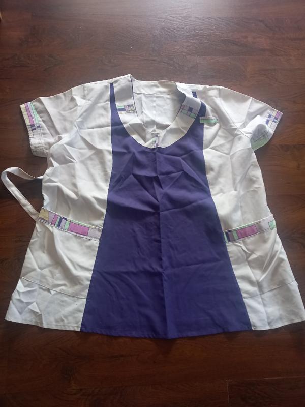 Форма женская, хлопок с емкостью.пояс для регулировки.Карманы по бокам.Трохи э потертости.по бокам внизу э разрезы. Размер: Длина 90см. Ширина в грудях 75см. Талия 79см.Ширина низу 93.см.