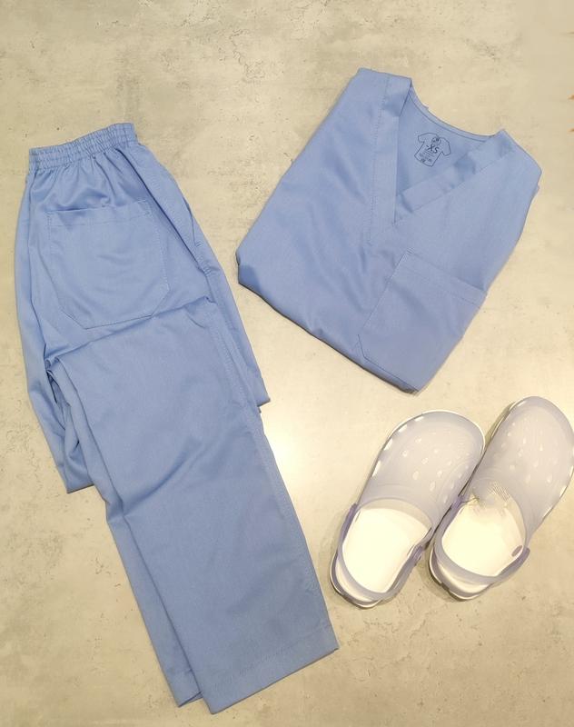 Медицинский костюм Воротник V подобный.Рукав короткий.Красочные для аксессуаров. Брюки прямого кроя. Пояс на резинке. Ткань:60% коттон, 35% полистер, 5 спандекс. В костюме очень комфортно.Ткань эластичная, мягкая, удлиненная. Цвет cie (вашлиновый), голубой.