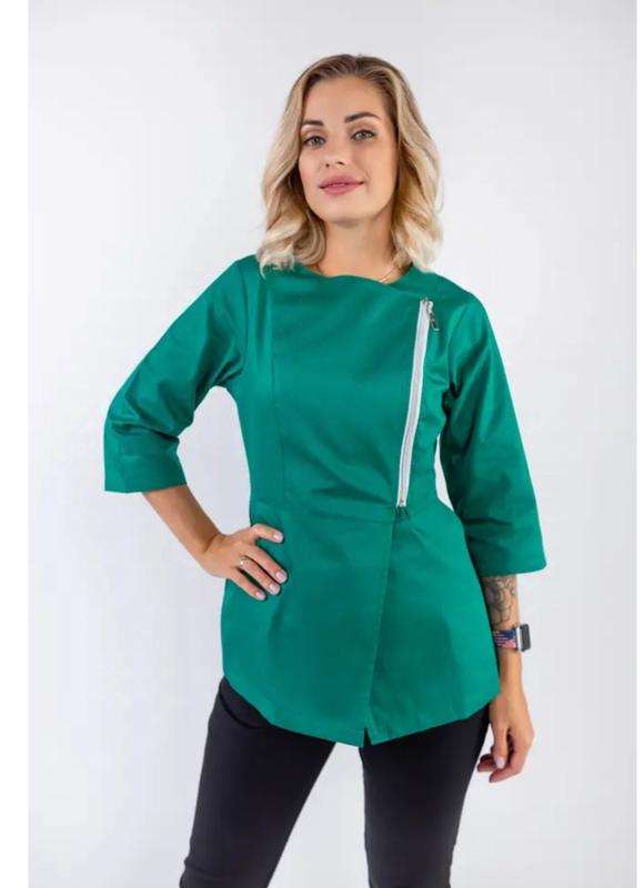 Очень красивая медицинская куртка в темно- зеленом цвете, в идеальном состоянии, бирка зарезанная, размер 60. Ткань твил. ( 65%полиэстер и 35 %хлопок). Рукав 3/4. Застежка на молнии. Имеет два боковых кармана. ОГ - 124-128, ОТ - 106-110, ОБ - 132- 136. , замеры выполнены по изделию.