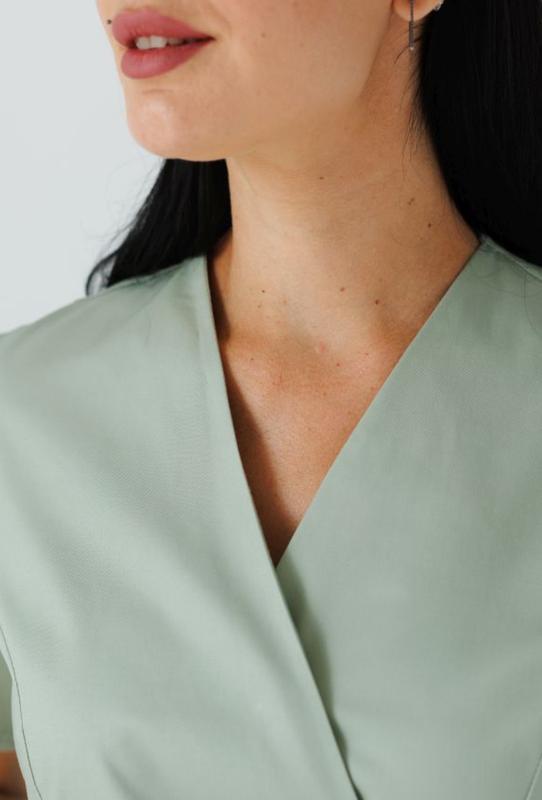 Костюм має приталений силует. Сорочка — на запах, із короткими рукавами, накладними кишенями, на спинці є накладний шов. Штани мають прямий крій, кишені, пояс та розрізи із боків. Костюм поєднує зручний крій та тканину із вмістом еластану. Колір фісташковий