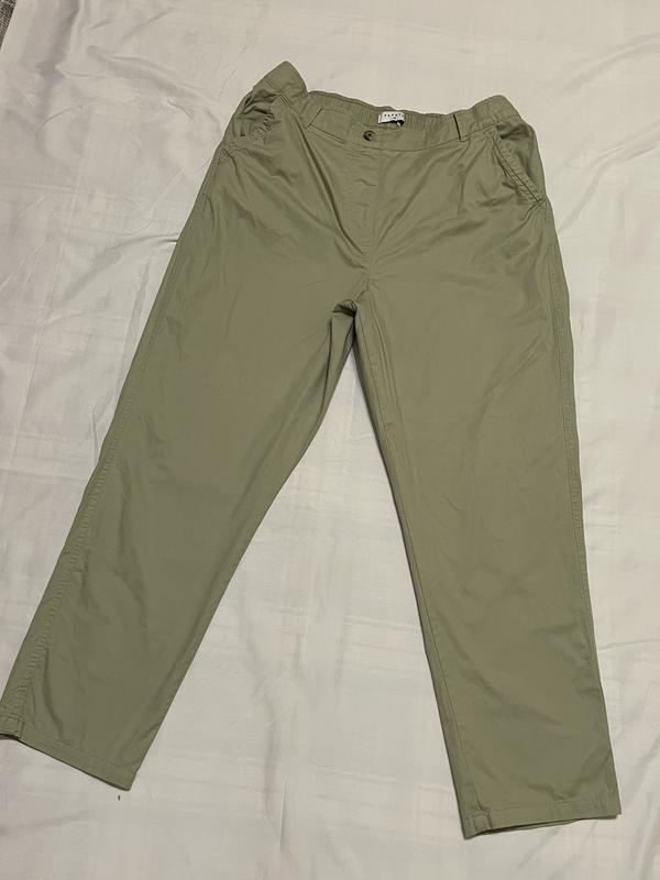 Брюки в ідеальному стані. Не одягалися Тканина 100% cotton. Колір « фісташка» Талія позаду на резинці є кишені з боків Заміри :40-50 см ПОС 55 см Довжина 97 см Внутрішній шов 68 см Посадка спереду 32 см, ззаду 43 см Низ 19 см