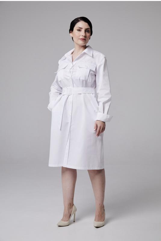 Mari Medi -новый дизайнерский бренд медицинской одежды люкс сегмента . Халат прямого силуэта с рубашечным воротником и погонами с пуговицами на плечах. Модель с длинным рукавом с манжетами,которые можно подворачивать. На груди украшен карманами с клапанами и пуговицами. Боковые карманы вшиты в швы. Длина изделия 100 см, рукав 60 см. В комплект входит пояс из ткани с пластиковой пряжкой. Дополнить образ можно поясом из эко-кожи с логотипом бренда Mari Medi. Пояса выполнены в двух базовых цветах -белом и сером .
