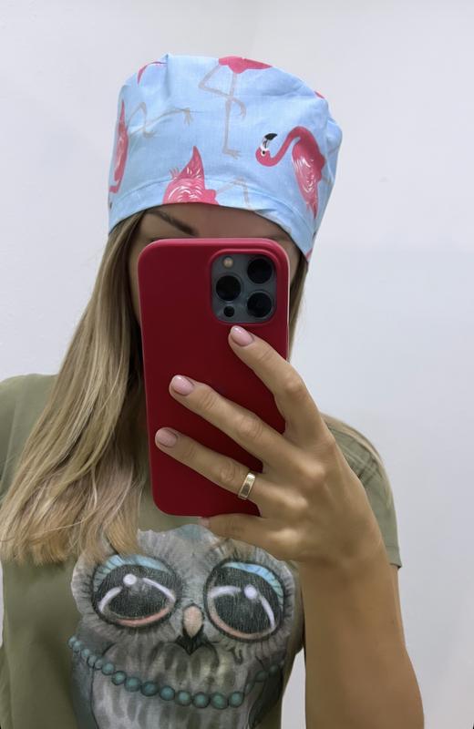 Шапка медика виконана із хлопковоі тканини. Легка, добре пропускає повітря та не парить. Цікавий принт в фламінго. Ззаду на резинці що дозволяє одягнути виріб на будь який розмір голови.