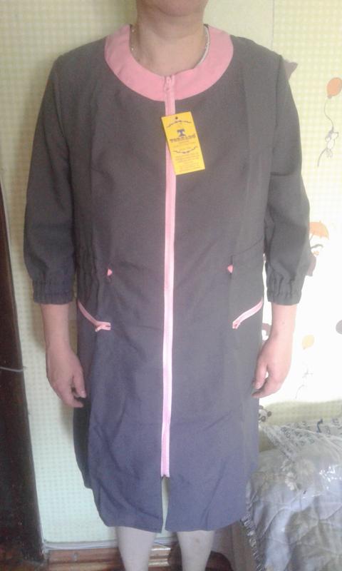 Халат жіночий (спецодяг ) на блискавці з боковими карманами. Матеріал поліестер. Розмір 48-50 Довжина 102 Рукав 43 ( три чверті ) Плечі 41 НОГ 55 НОБ 58