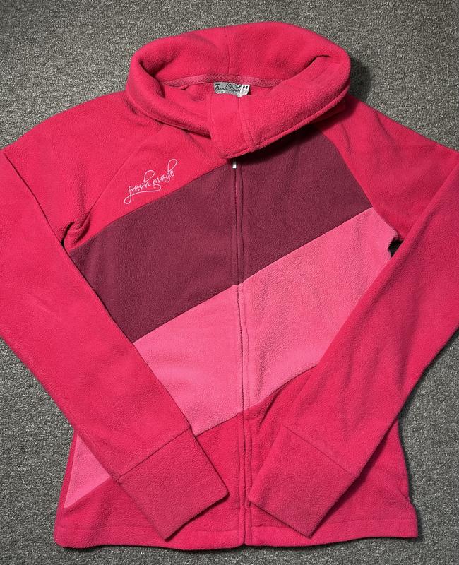 Флисовая ,очень тёплая кофта в ярко розовых оттенках . С воротником под горло на липучке.Что бы зафиксировать на шее,и использовать вместо шарфа . Рукава регланы .Бренд Fresh Made . ПОГ -48 см. ПОТ -41 см. Длина изделия-61 см. Длина рукава от шеи 77 сс
