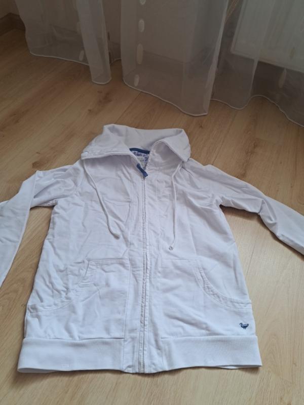Женская спортивная мастерка белого цвета. Без капюшона, вместо него притачной бафф. можно откидывать на плече.