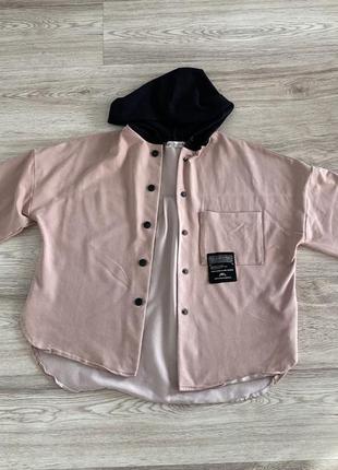 Стильна сорочка-бомбер із капюшоном Стильна сорочку у спортивному стилі, Пудрова із чорним капюшоном. Зручний вільний крій, довгі рукави, застібається на кнопки, є кишеня, тканина приємна до тіла