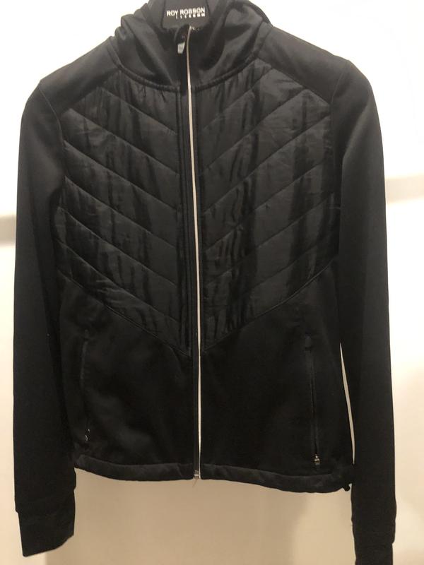 Спортивна кофта на змійці, чорного кольору Заміри: Ширина плечей- 40 Довжина - 64 Довжина рукава- 70 з резинкою На рукаві є маленький дефект, біла крапля (на останньому фото)