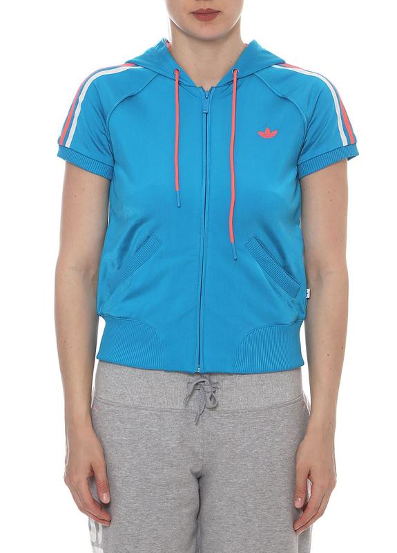 Спортивная кофта бирюзового цвета с коротким рукавом. Имеет капишон, ярко-розовую подкладу, карманы. Застегивается на молнию. Стан идеален. Размер по набору 10. Замеры: под руками - 44см, длина по спинке - 52см.
