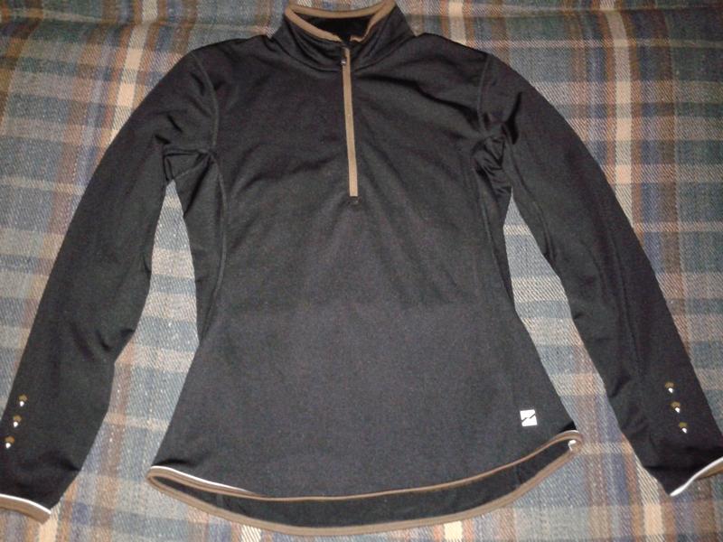 Кофта в очень хорошем состоянии. Никаких повреждений, без зацепок, без затяжек, без потертостей. Трикотаж выглядит отлично. Цвет черный, глубокий. Отделка светло-коричневого и белого цветов. Состав 90% полиамид, 10% эластан. Трикотаж очень приятный, мягкий, тянется тоже мягко. Верх (лицо) трикотажа гладкий, как эластик. Изнанка шероховатая, мягкая, к телу приятная. Кофта стандартной длины, немного как приталена. Низ немного полукругом. Застегивается на змеечку. Ворот - горловина. Кофта лыжная, для занятий спортом. Размер стоит 40/L, реально на полномерный М. Замеры: - длина по спинке от горловины - 62 см, - плечи - 41 см, - от подмышки к подмышке - 47 см, - в туловище - 41 см, - по низу - 49 см, - рукав - 61 см. Замеры в разложенном состоянии, трикотаж неплохо тянется. Кофта оригинальная.