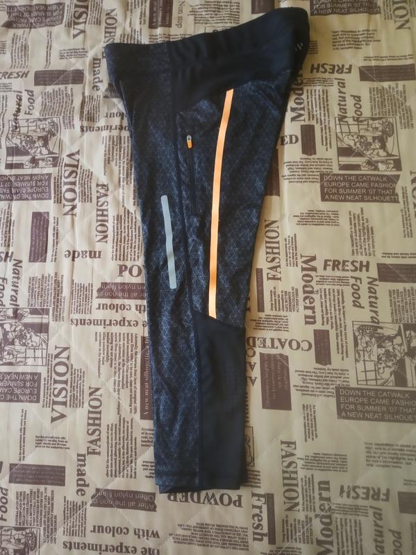 Лосины из тонкого стрейчевого полиэстера с мембранными вставками, укороченные. Пояс-34 бёдра-36 длина-68, замеры указаны в спокойном состоянии хорошо тянется.