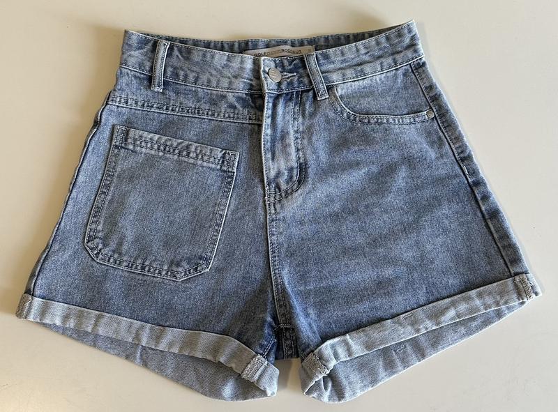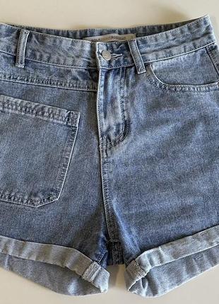Джинсові шорти з накладною кишенею по переду та заду. Обхват талії - 64 см Обхват стегон - 94 см Довжина виробу - 37 см