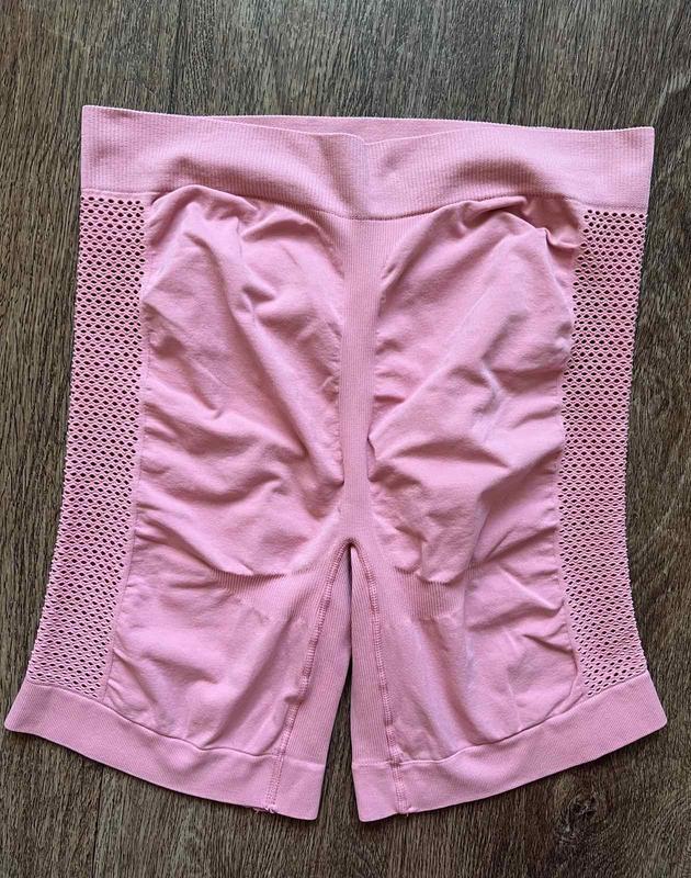 Шорты бесшовные спортивные, с высокой посадкой, велосипедки размер M-L, длина 41 см, полуобхват талии 33 см, полуобхват бедер 37 см, высота посадки спереди 29 см, очень хорошо тянутся, по бокам вставки просвечиваются, узор на ягодицах подчеркивают попу, красивый розовый цвет