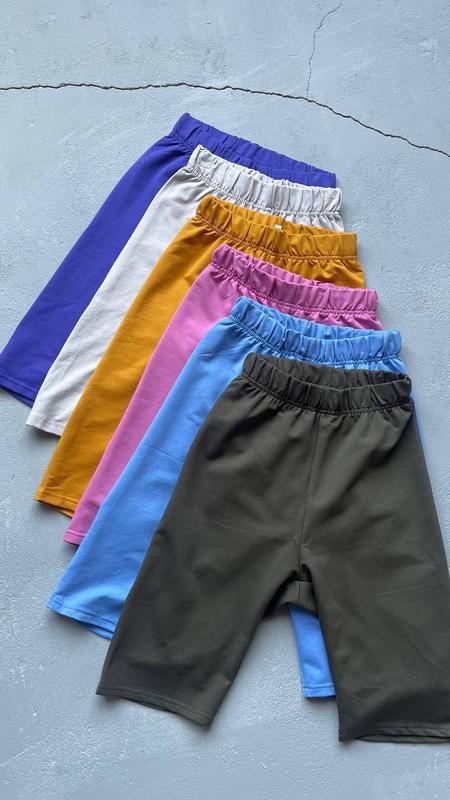 🤍Велосипедки 🤍 арт.0320 Тканина: турецький трикотаж (80% бавовна, 20% еластан) (не скочується, не втрачає колір) Колір: світло-сірий, фіолет, цегла, беж, рожевий, молоко, блакитний, гірчиця Розмір: 42-44 Висока посадка, талія на гумці. Дуже зручні.
