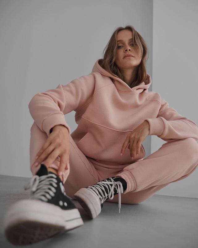 П: Стильный, теплую, удобный спортивный костюм на флисе в нежно-розовом цвете (пудра), хорошего качества от Украинского бренда Obzor. Худи с капюшоном и карманами. Брюки с карманами, резинки на поясе и по низу изделия. Состав: 90% хлопок 10% полиэстр (утеплитель). Все вещи новые и с оригинальными бирками. Дополнительные фото, фото на себе и замеры скинем в частные уведомления.