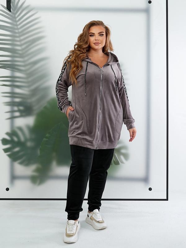 Костюм: кофта та штани 1💰😍 Цена: 1340 грн 💰😍 2 Цвет:черные брюки/ кофта капучино, черный, зеленый 3 Ткань: велюр трикотаж, приятный, эластичный. 4 Код: 1386 5 Размеры: 52-54,56-58 60-62,64-66 6 Замеры: длина кофты 78см, рукавом горловины 73 см, длина брюк сбоку 104 52-54: кофта вог 130, про 132, про штани 114 56-58: кофта огн 138, о 140, о брюках 122 60-62: кофта вог 146, про 148, про штани 130 64-66: кофта вог 154, про 156, 138 про штани Брюки по спокойно можно + 8 см одеть