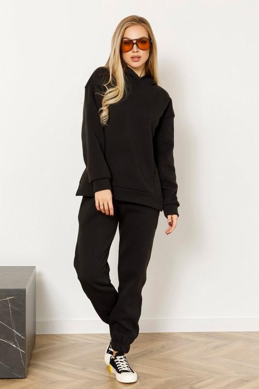 12955_черный Свободный теплый костюм выполненный из черного однотонного трикотажа на флисе. Худи прямого свободного кроя с карманами и боковыми разрезами. Изделие с манжетами, длинными рукавами и капюшоном. Брюки джоггеры с карманами и резинками на манжетах и поясе.