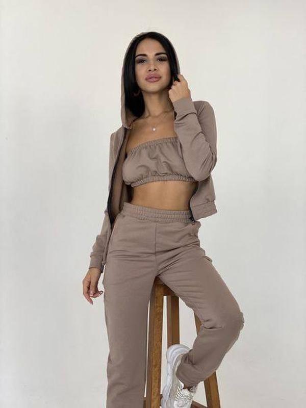 🇺🇦Тканина: двухнитка 🇺🇦Кольори: капучино. Белый, красный, зеленый, серый, персик, черный, мятный (смотреться в профиле) 🇺🇦Размер: 42-46 Спортивный костюм тройка выполнен из ткани двунитки, которая является мягкой и комфортной на ощупь, что делает его идеальным выбором для тренировок или свободного времени. Трикотажный топ и кофта короткой длины имеет капюшон и застегивается на молнию, что добавляет им элементов стиля и удобства. Брюки также сделаны из двуунитки и имеют манжеты на концах, что добавляет дополнительное удобство и сохраняет тепло. Он идеально подходит для занятий спортом, фитнеса или просто для отдыха в удобной одежде. Этот костюм тройка обеспечит вам комфорт и стиль, когда вы занимаетесь физическими упражнениями или проводите время на открытом воздухе.