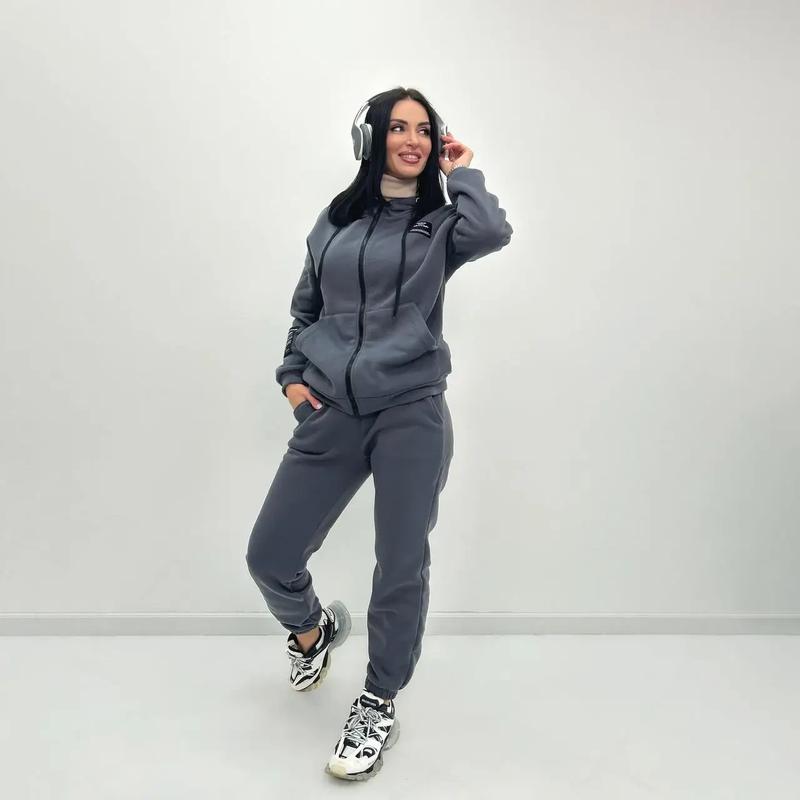Спортивный костюм состоит из кофты с капюшоном на молнии и штанов на манжетах с карманами - Длина кофты от плеча: 67-68 см - Длина рукава от горловины: 72-73 см - Длина шагового шва: 71 см - Длина бокового шва: 99-100 см - Материал: Трехнитка на флисе (Китай)