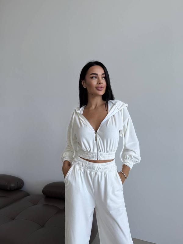 🔤🔤🌸 🔤🔤🔤🔤🪷 # 625 Наша реальная фотосессия📸 ▪️Цвет: белый,черный ▪️Размер 42-48(единственный) ▪Ткань дорогой велюр Турция 🇹🇷 Стильный повседневный костюм из приятного и мягусенского к телу велюра. Модель с приспущенными плечами оверсайз, по талии резинка👍Брюки палаццо на резинке с широким кроем и высокой посадкой. Очень удобная и стильная модель, как для прогулок так и выездов на природу. В ней вы будете чувствовать себя комфортно