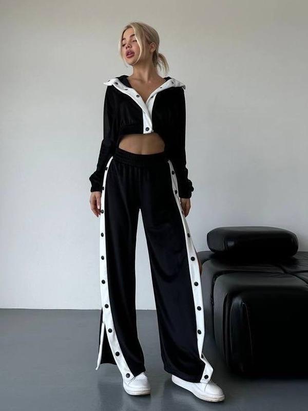 ♥️Стильний костюм на кнопках 🖤Мод:692🖤 Тканина: Плюш-велюр Вся фурнітура робоча Висока посадка штанів ☑️Якісна фурнітура Розміри: 42-44;46-48 Колір: чорний з білим ▪️Виміри▪️ мод:692 42-44 ПОГ-56 см ПОТ-33 см ПІБ-50 см Довжина штанів-105 см. Довжина кофти-47 см. 46-48 ПОГ-58 см ПОТ-36 см ПІБ-53 см Довжина штанів-105 см. Довжина кофти-48 см.