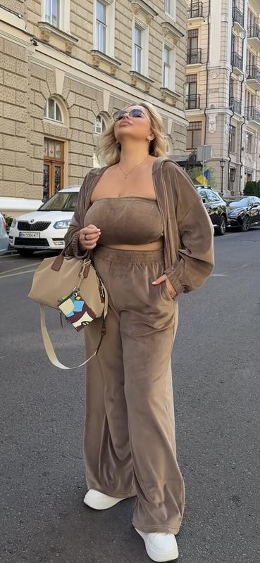Розмір 2 XL Худі Ог:98-133 см От:78-116 см Д рукава по внутрішньому шву: 43 см Д виробу по спинці: 56 см Топ: Ог:95-102 см Д виробу по боковому шву: 17 см Брюки От:78-104 см Об:106-117 см Д виробу по кроковому шву: 80 см Д виробу по боковому шву:112 см Кофта з капюшоном , топ та брюки Брюки на резинці, по бокам кишені