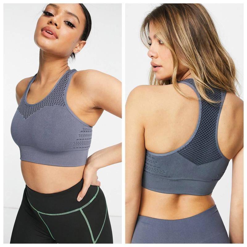 НІТ - Спортивный топ бюстгальтер чёрного цвета бесшовного дизайна с вентиляционными панелями. Функциональный Стильный Плотный Компрессионный Двухслойный Размер М Состояние - новый В наличии - в чёрном цвете Фото из каталога в серо-голубом цвете для наглядности - та же модель - лучше видны детали Замеры в спокойном состоянии Тянется упруго ( компрессионный) Между проймами 32 см Ширина по низу резинки 31 см ( ширина резинки 5 СМ) Ди 31 см и 16 см от низа проймы 83% полиамид и 17% эластан