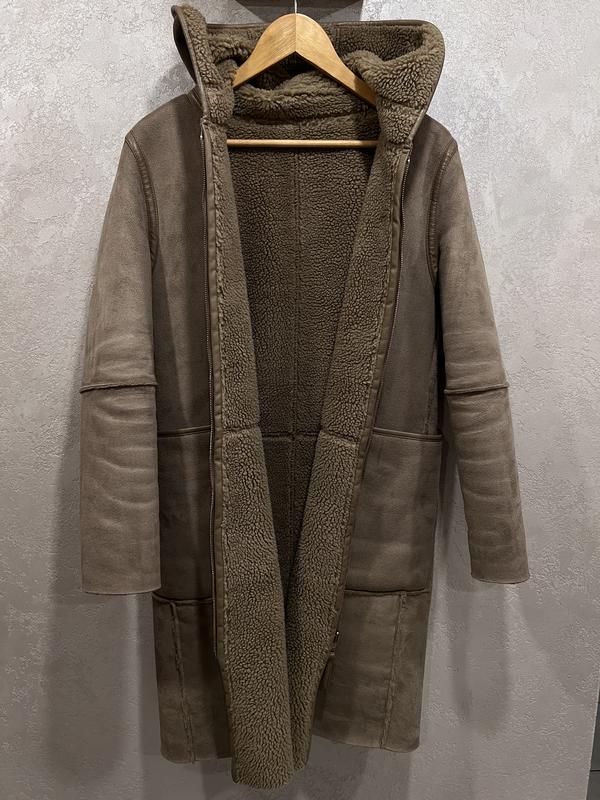 Утепленная дубленка с карманами. Модель с длиной ниже колен и классическим воротником оснащена длинными рукавами.