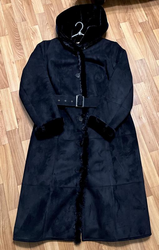 Тепла, натуральна якість. Чорний колір. Прямого крою, є пояс. 54 розмір. Стан нової речі!