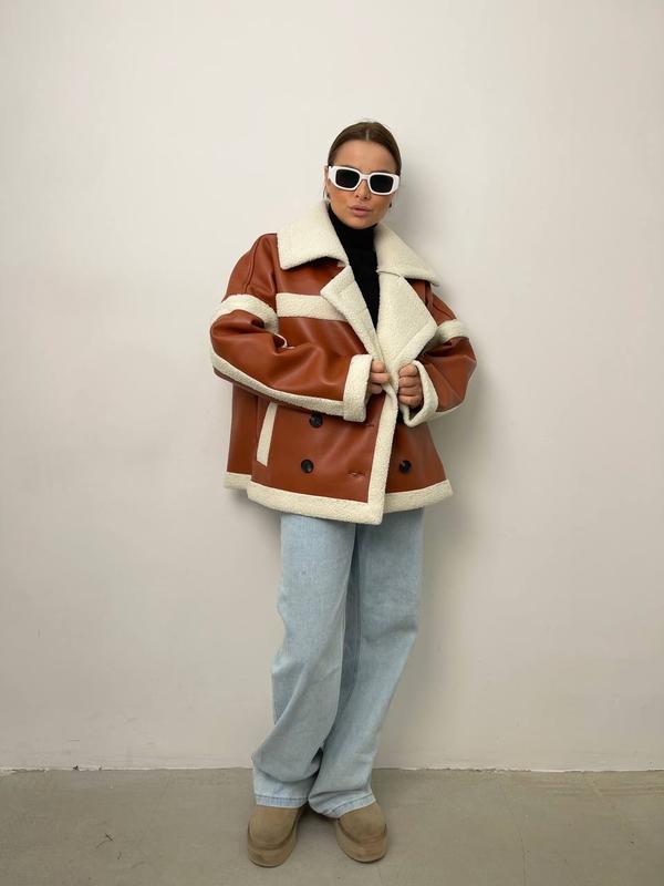 Эко-кожа, искусственный мех под овчину от натуральной не отличить совсем, она такая же мягкая, приятная. На пуговицах, кожа плотная. Размер 42-48❤️🔥