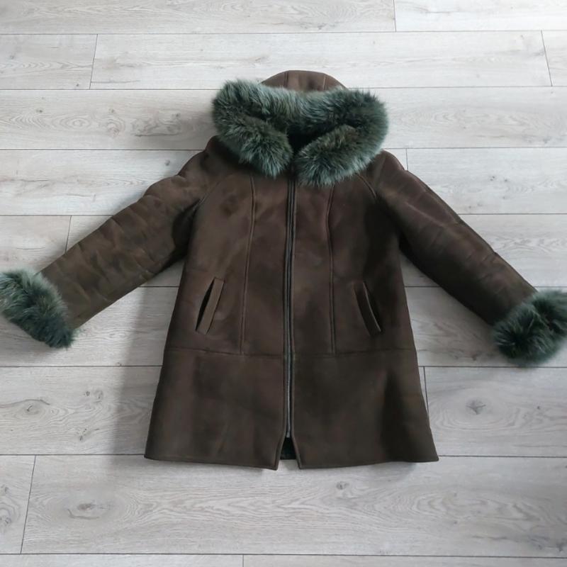 Теплая, легкая дубленка. Цвет темно-зеленый, на фото не переданы. Замеры по вн.швам: пог - 57 см поб - 59 см длина - 78 см Целая, замок рабочий. Отсутствие - "собачка" рабочая, но уже "вкороченная", мех на рукавах с внутренней стороны немного затерто. Дополнительные замеры, фото - на Ваше желание.