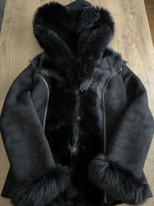 Натуральная кожа/мех дубленка, короткая с большим теплым капюшоном, размер М.