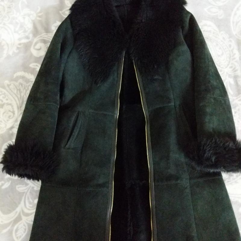 Дубленка-черная женская,натуральная кожа,на молниев, объем по талиям развернутому стану 105 см. Длина по спинке от воротничка 95см. длина рукава 64см.
