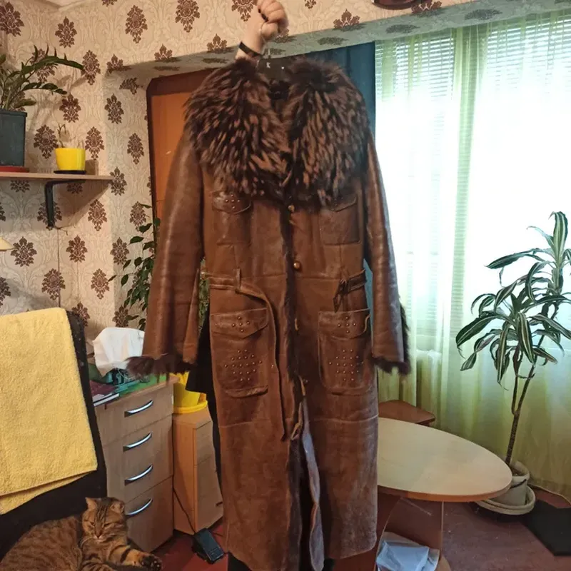 Продам б/у дублёнку женскую. Длина 128 см, обхват груди 128 см, обхват талии 108 см. 4 накладных кармана, пояс, мех не съёмный. Состояние на твердую 4, мало носилась. Потерялась пуговица, по-хорошему нужно будет заменить все, т.к. подобную не нашла. Торг