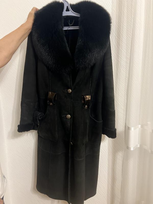 Дубленка черного цвета, с натуральным мехом (песец) Без дефектов и повреждений,прямая,с поясом При росте 160 она чуть ниже колена Размер