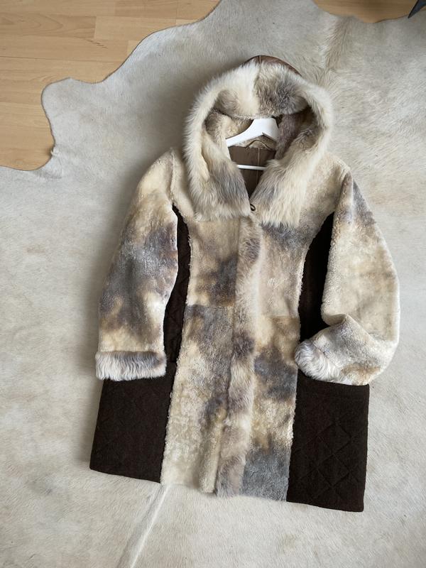 Стильна комбінована дублянка з натуральної шкіри та стьобаної вовняної тканини в бежево-коричневих кольорах в дуже гарному стані. Бірки відсутні. Підійде на розмір 48-50.