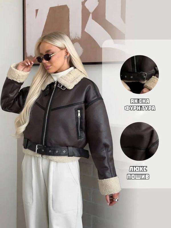 Дублянка авіатор Дублянка авіатор вкорочена ✈️ Стильна та тепла модель із натуральним ефектом під овчину. 🔸 Утеплена густим штучним хутром 🔸 Комір-стійка з пряжкою для захисту від вітру 🔸 Зручна застібка-блискавка + ремінь на талії 🔸 Манжети та низ оздоблені хутром 🔸 Дві глибокі кишені на блискавці 🔸 Універсальний фасон, підходить під будь-який стиль ▪️Трендовий фасон “авіатор” ▪️Дуже тепла й комфортна для холодної пори року ▪️Виглядає дорого та стильно ▪️Модель: 0/ рнС10<18>265<106 ▪️Тканина: екошкіра + штучне хутро ▪️Розмір: S (42) ,M(44), L(46) ▪️Колір: глибокий шоколад з бежевим хутром.