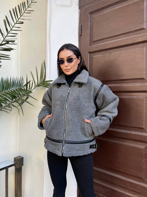 Размеры: 1(42-44); 2(46-48) Ткань : плотное эко мех, стеганая подкладка на утеплителе, эко кожа. Цвет: молоко, графит замеры по изделию: 1(42-44) ОГ-114; ОБ-114 Длина по спинке-65см Длина рукава от горловины-72см 2(46-48) ОГ-120;ОБ-120
