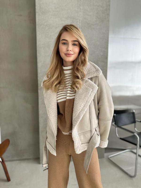 Дубленка из эко замши с эко мехом Сезон - деми Фабричный Китай Размер s,m,l Цвет светлый беж Замеры: Размер s ог до 92 Рукав, плечо немного спущенное 58 см Длина 54 см Размер м ог до 96 см Рукав, плечо немного спущенное 59 см Длина 54-55 см Размер L Ог до 100 Рукав, плечо немного спущенное 60 см Длина 55-56 см 000610