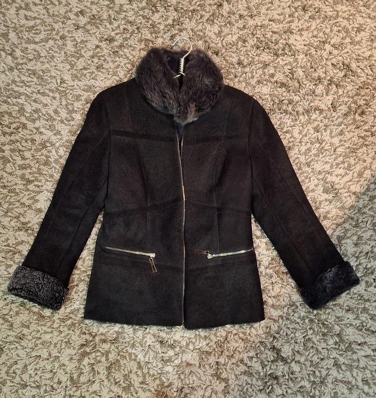 Дубленка женская.Колир черный.Натуральная замша.Штучный мех.Застежка на молнии.Есть карманы на молнии.Йде на размерS.