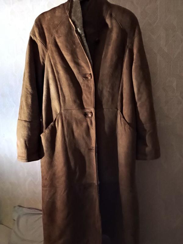 коричневого цвета, 2 фото освещенных камерой, 2 фото темнее- то есть существующий цвет, длина 1м20см, ширина полуобхват 59, длина рукава, от изделия шеи, 80 см. нет одного подплечника, для объема плеча