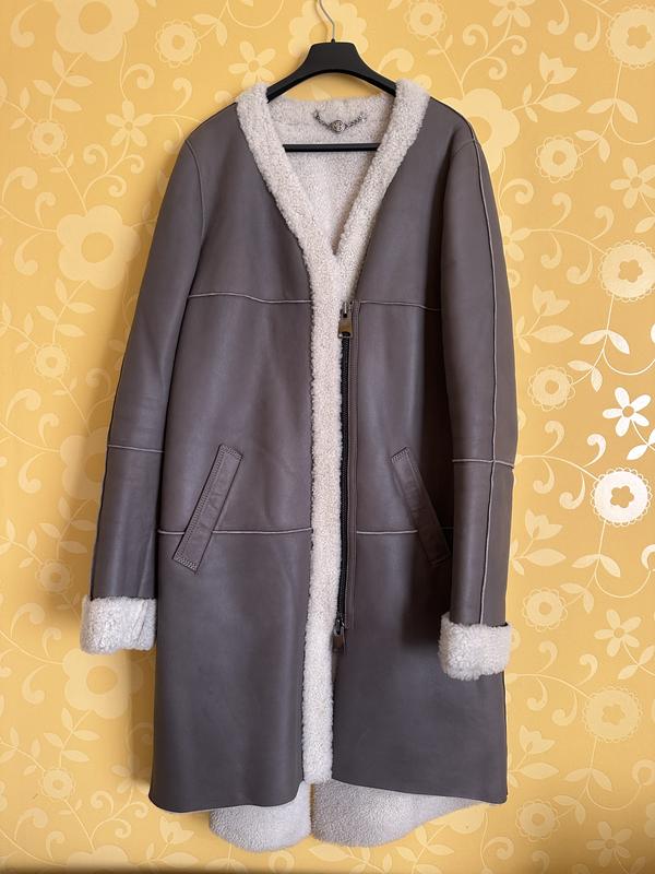 Почти новая, два раза одевала, в идеальном состоянии Натуральная овчина, шила по заказу Удлиненная спинка Замеры: Длина спереди (от горловины) - 96см Пол обьем под подмышками - 51,5см Длина по спинке (центральный шов от меха) - 102см Длина рукава - 68,5см (74,5см)